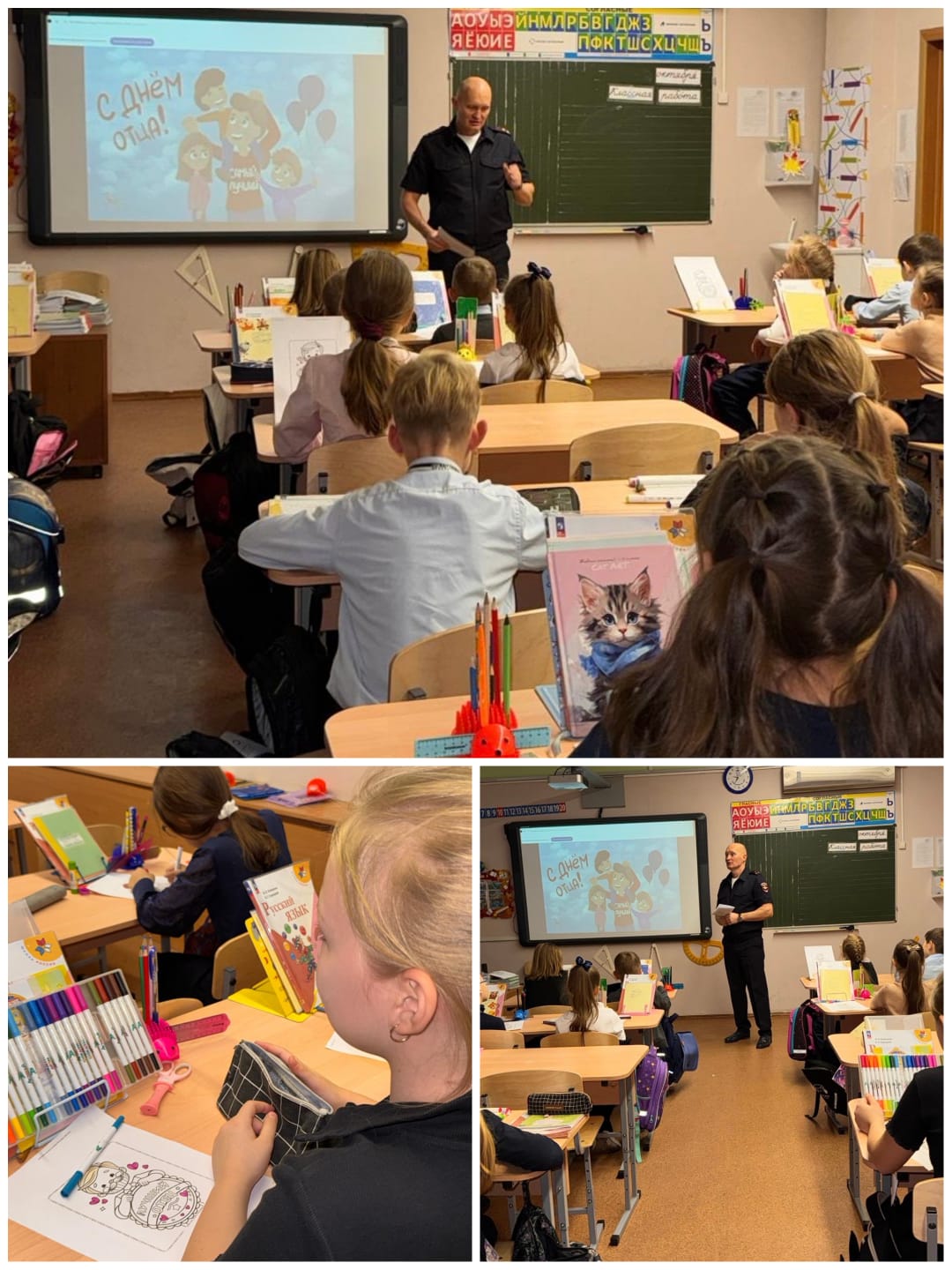 Наши третьеклассники подготовили мероприятие, посвященное этому дню. На уроках труда они сделали поделки с пожеланиями и выразили свою любовь и уважение к папе. Один из пап рассказал о своей профессии и о том, что его вдохновляет. На школьной доске дети написали, какими они видят своих пап.